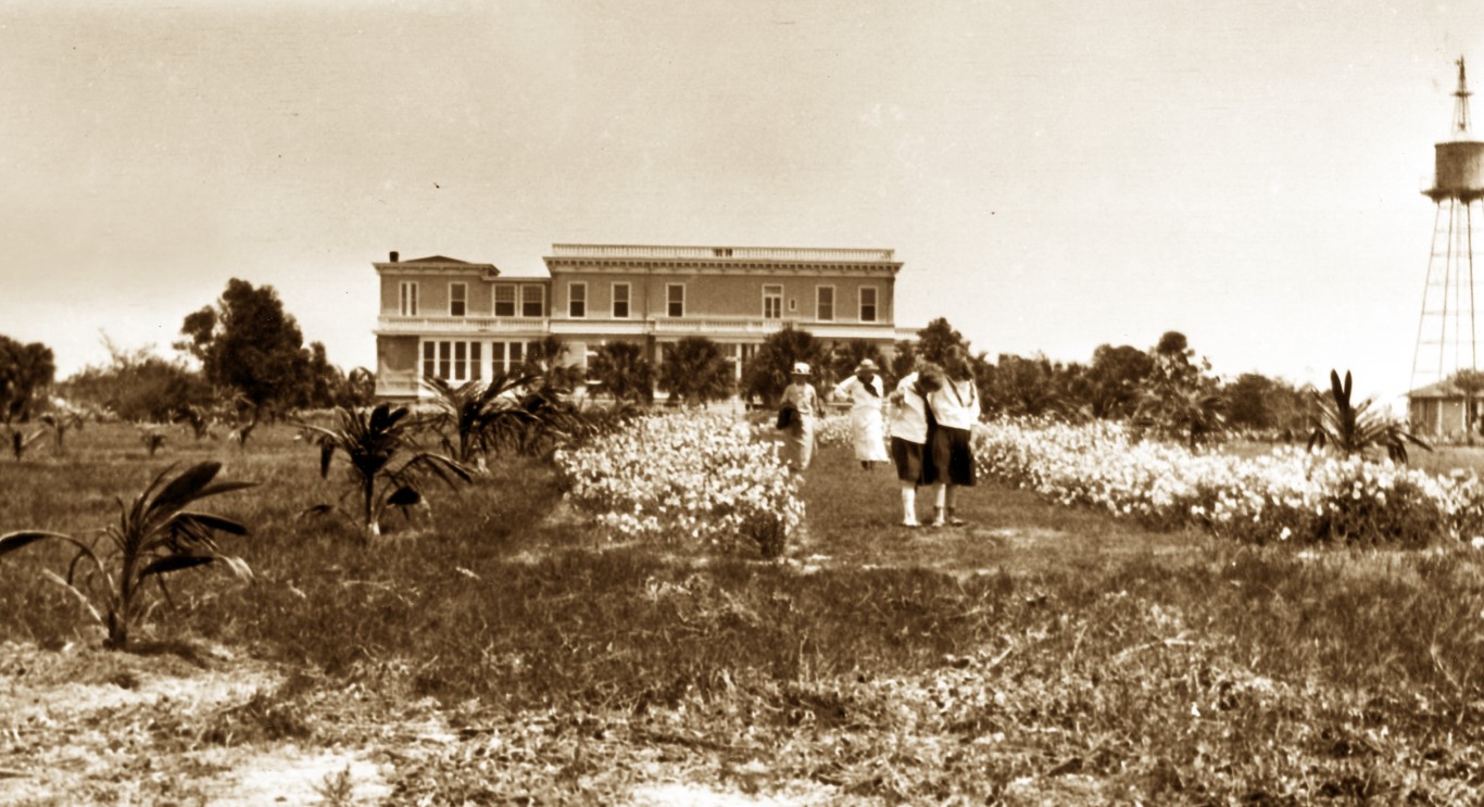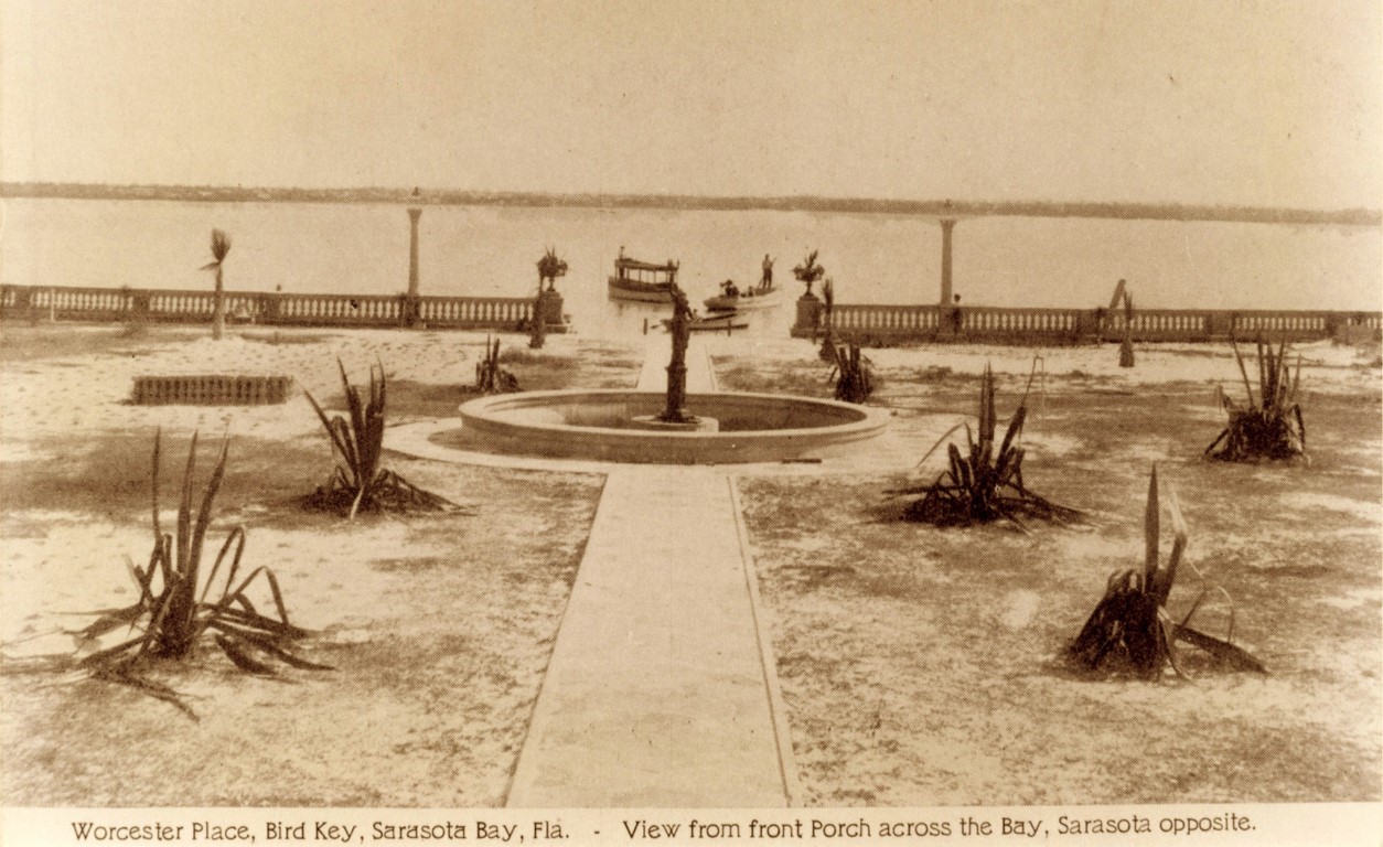 At the beginning of the nineteenth century, Bird Key was a small island in Sarasota Bay, rising only a few feet above the surrounding shallow grass flats. In 1906, Thomas Martin Worcester, of Cincinnati, purchased the 12-acre island, and after some dredging and filling, began to build a castle for his beloved wife, Davie Lindsay Worcester. He would name it The New Edzell Castle, after his wife’s Scottish ancestral home. Sadly, his wife died in October 1912 and did not live to see the completion of her husband’s “labor of love.” The first mansion in Sarasota boasted electric and gas lights, steam heat, and hot and cold running water in every room. At the opening reception in 1914, the Sarasota Times wrote, “Set in one of nature’s fairest temples, it is a monument to the memory of a gifted and a good woman.”